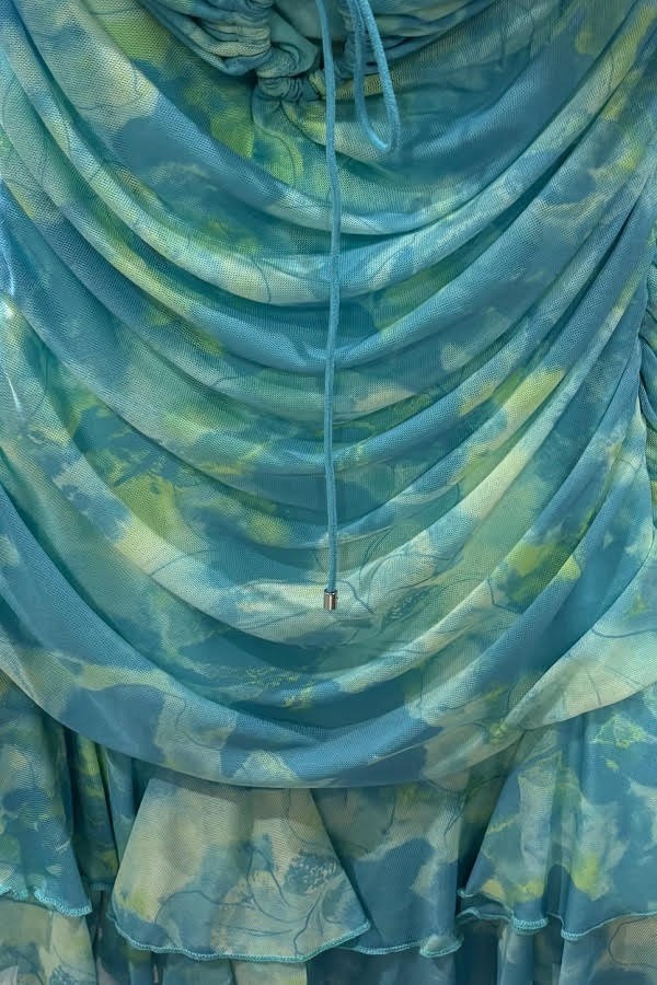 ABSTRACT PRINTED TUBE RUFFLE MINI DRESS