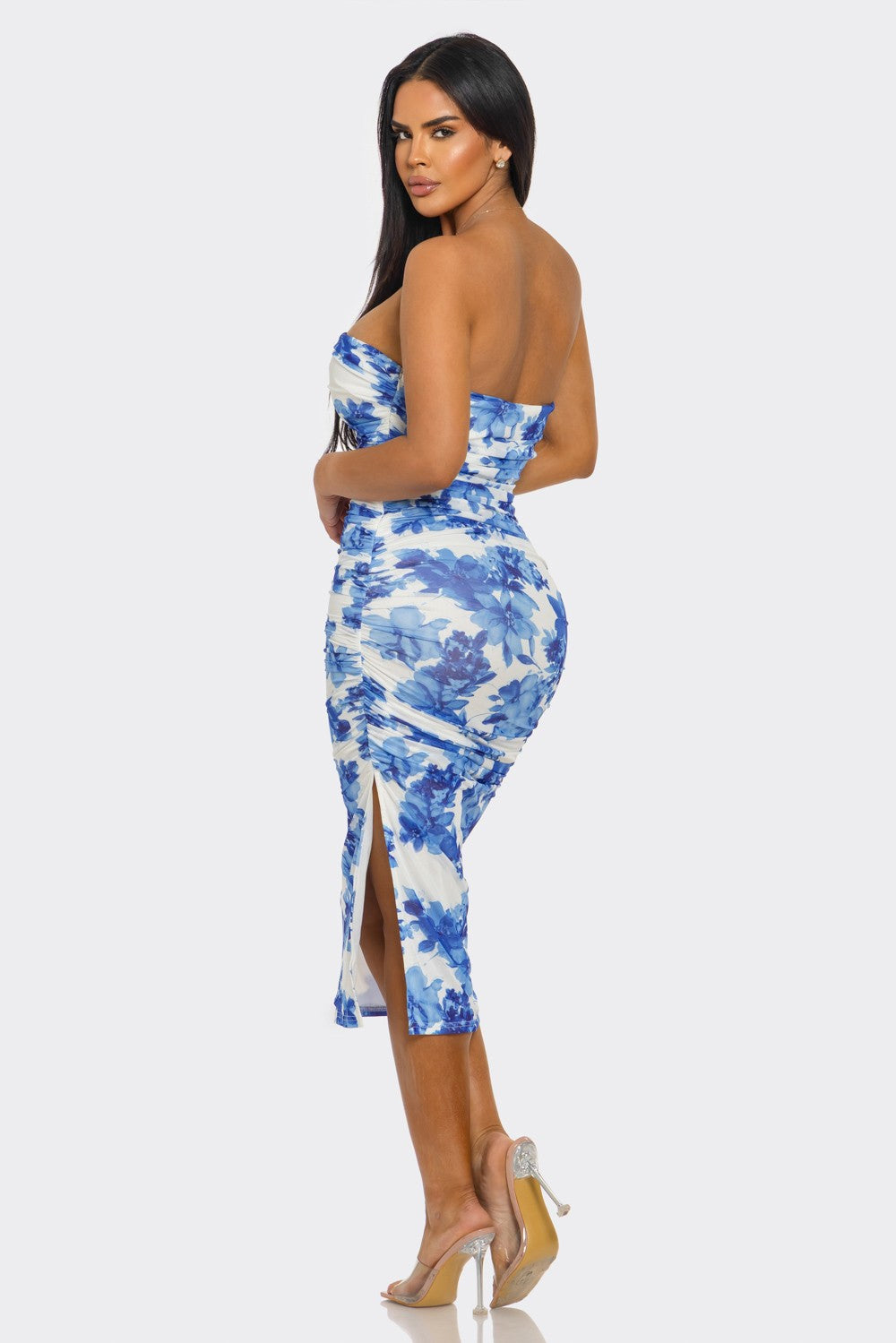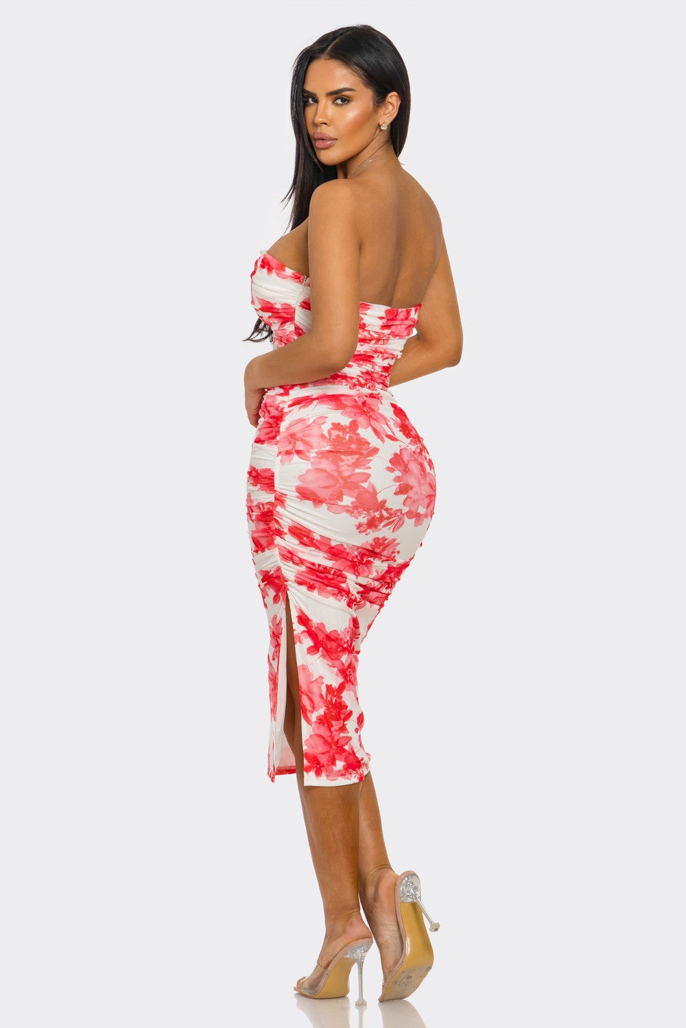 midi-length dress sculpts the body with precision. The ruched detailing