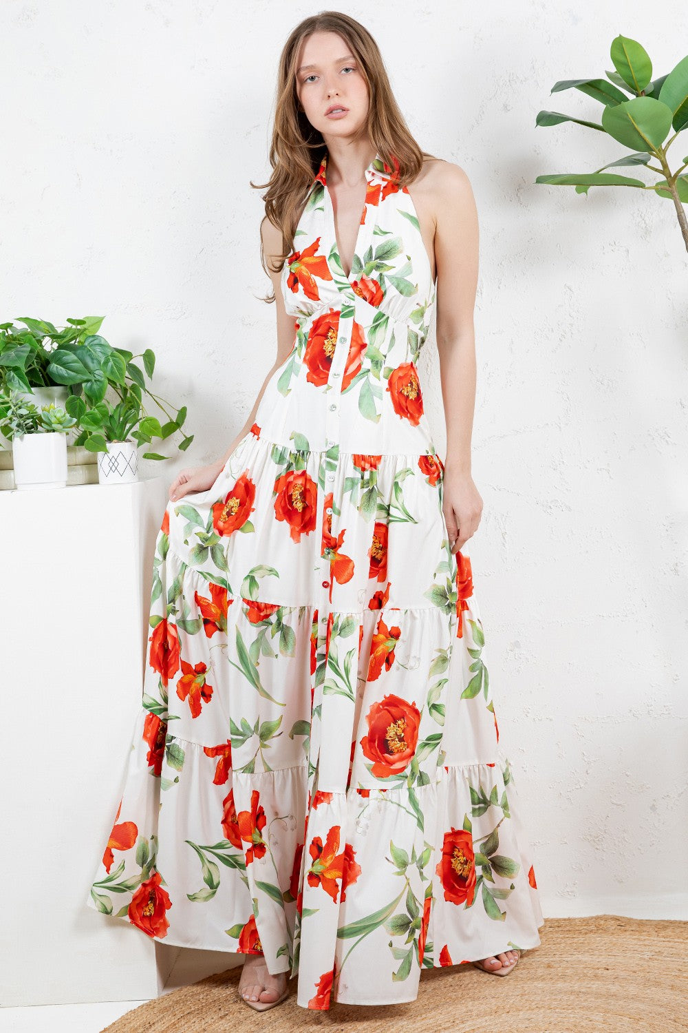 FLORAL COLLARED V-NECK BUTTON DOWN OPEN BACK MAXI DRESS 100% POLYESTER Size S(2) - M(2) - L(2) Made In China *MODEL IS 5'7" AND IS WEARING A SMALL