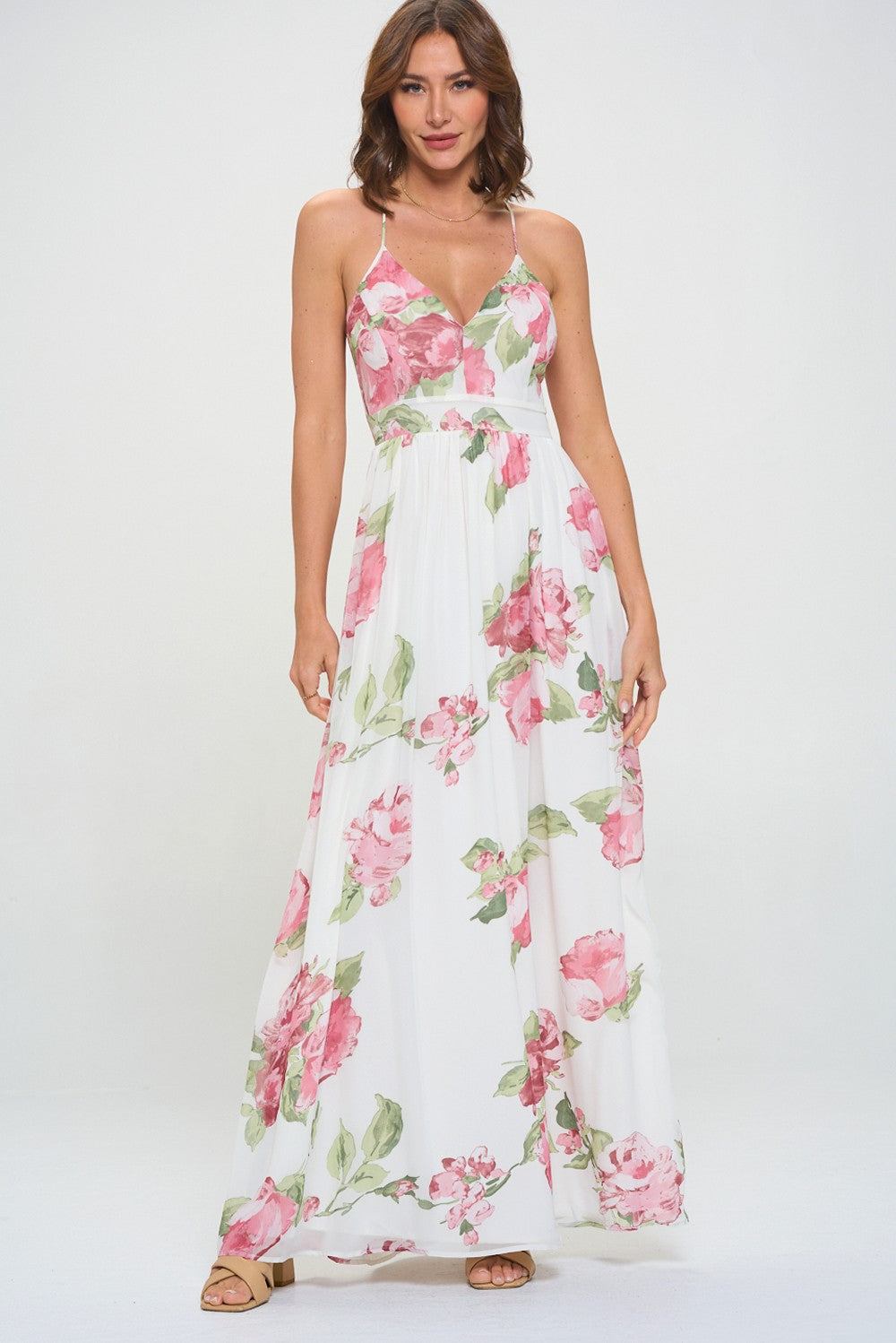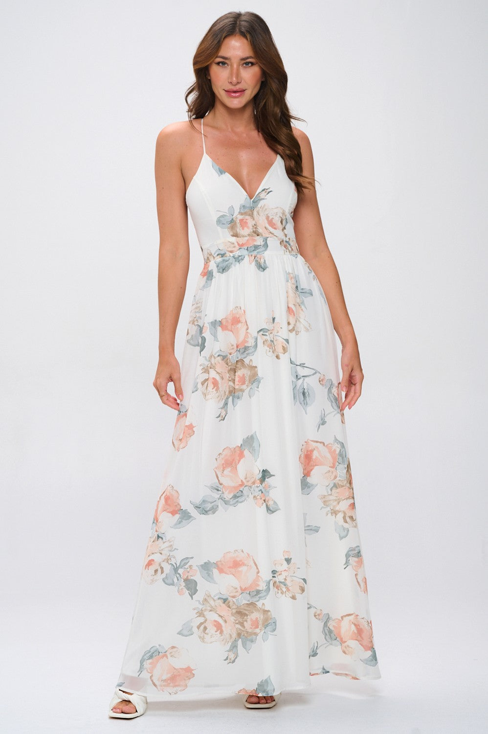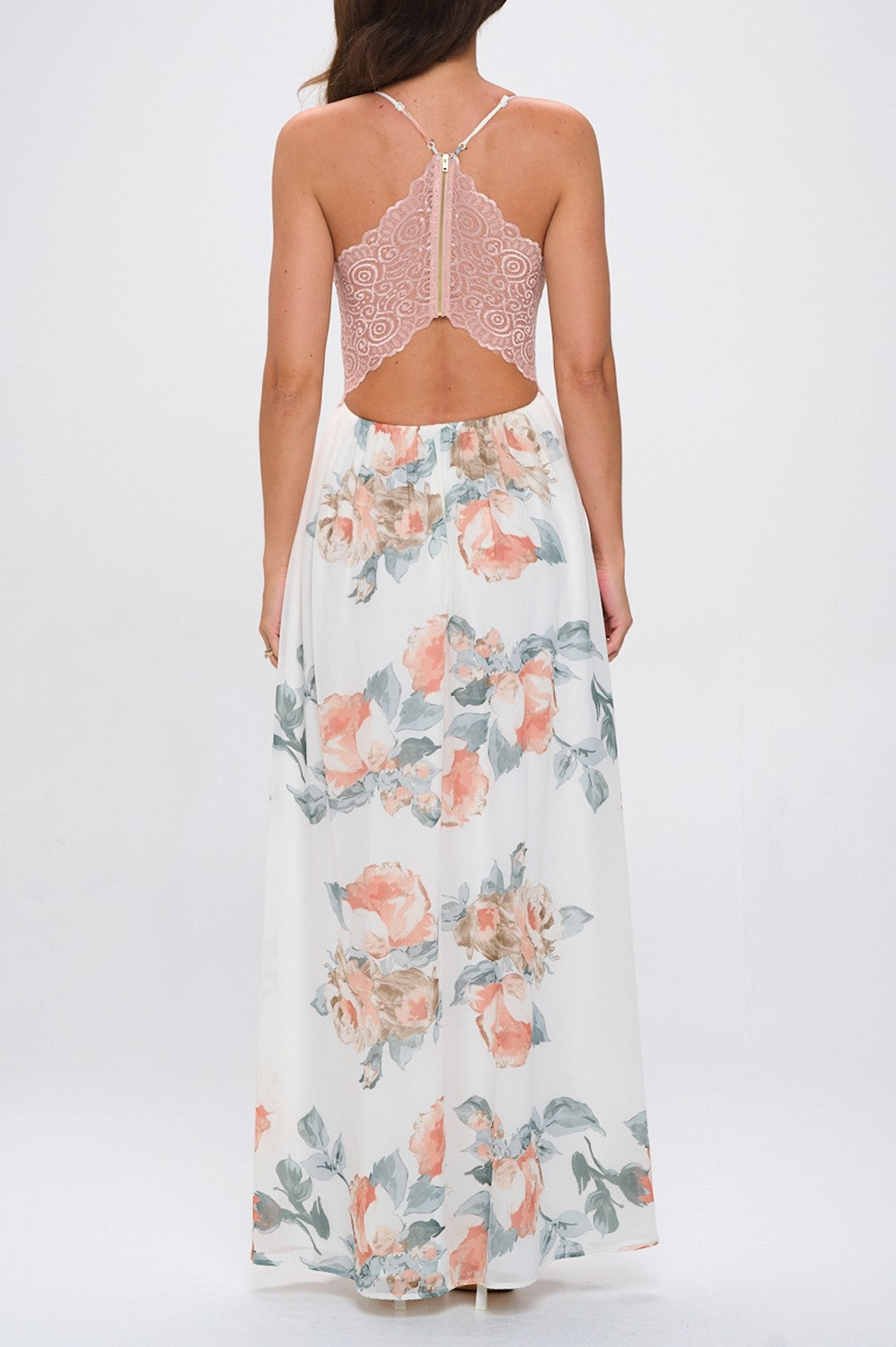 - CHIFFON - V-NECKLINE - LACE TRIM BACK W/ ZIPPER - ELASTIC WAISTBAND - FULL LINING - FIT AND FLARE MAXI DRESS - SALMON FOR COLOR REF ONLY