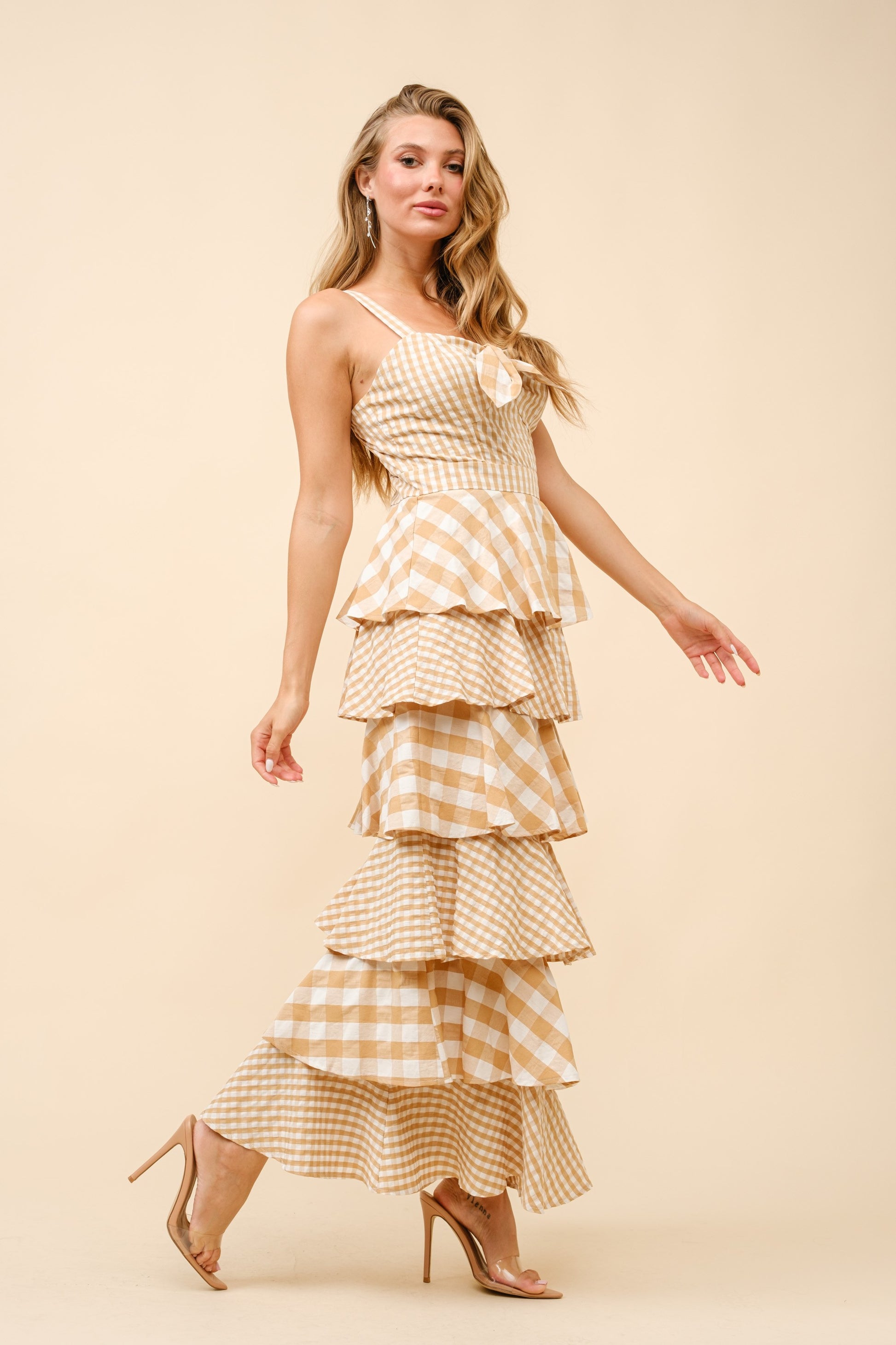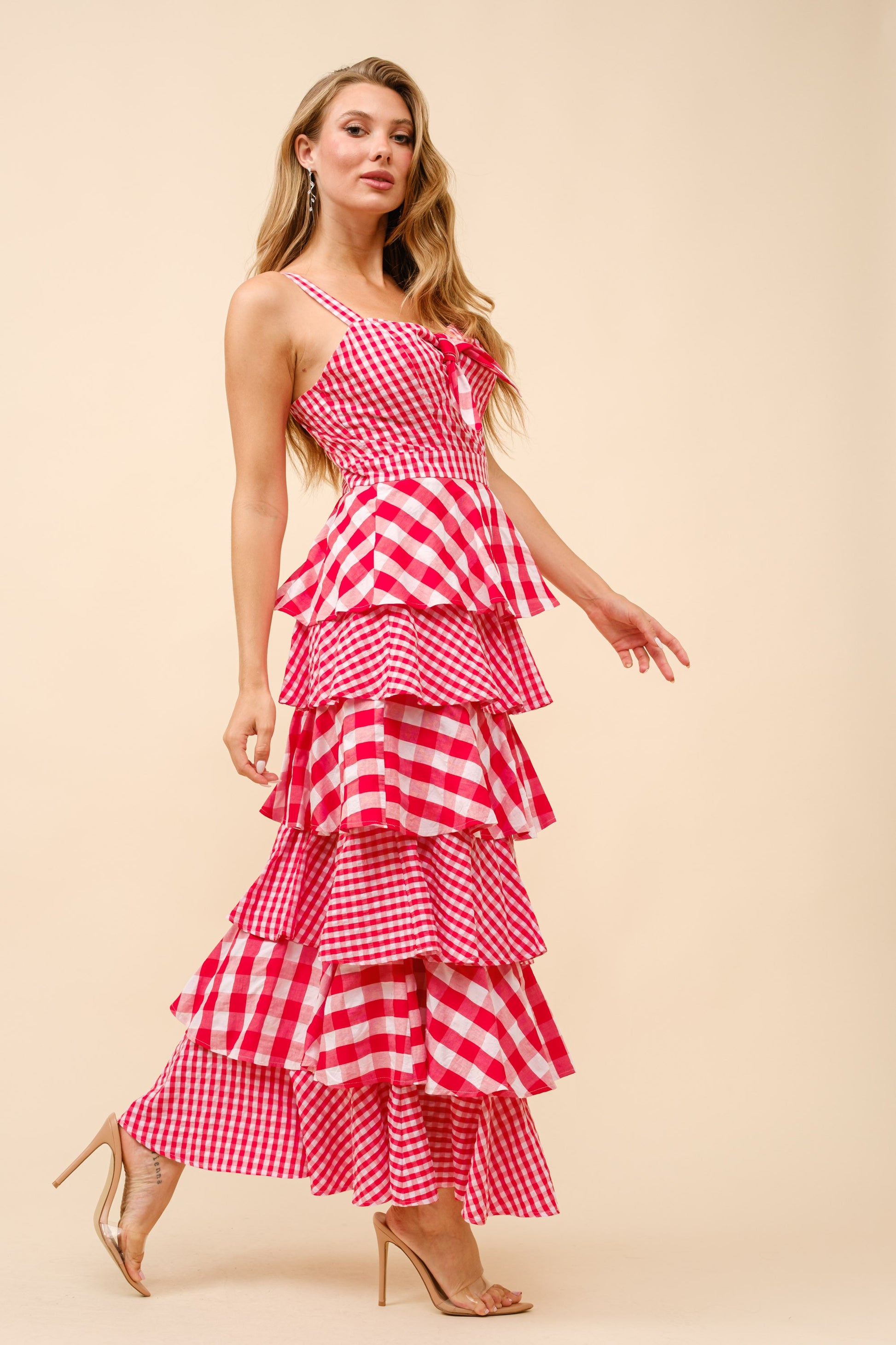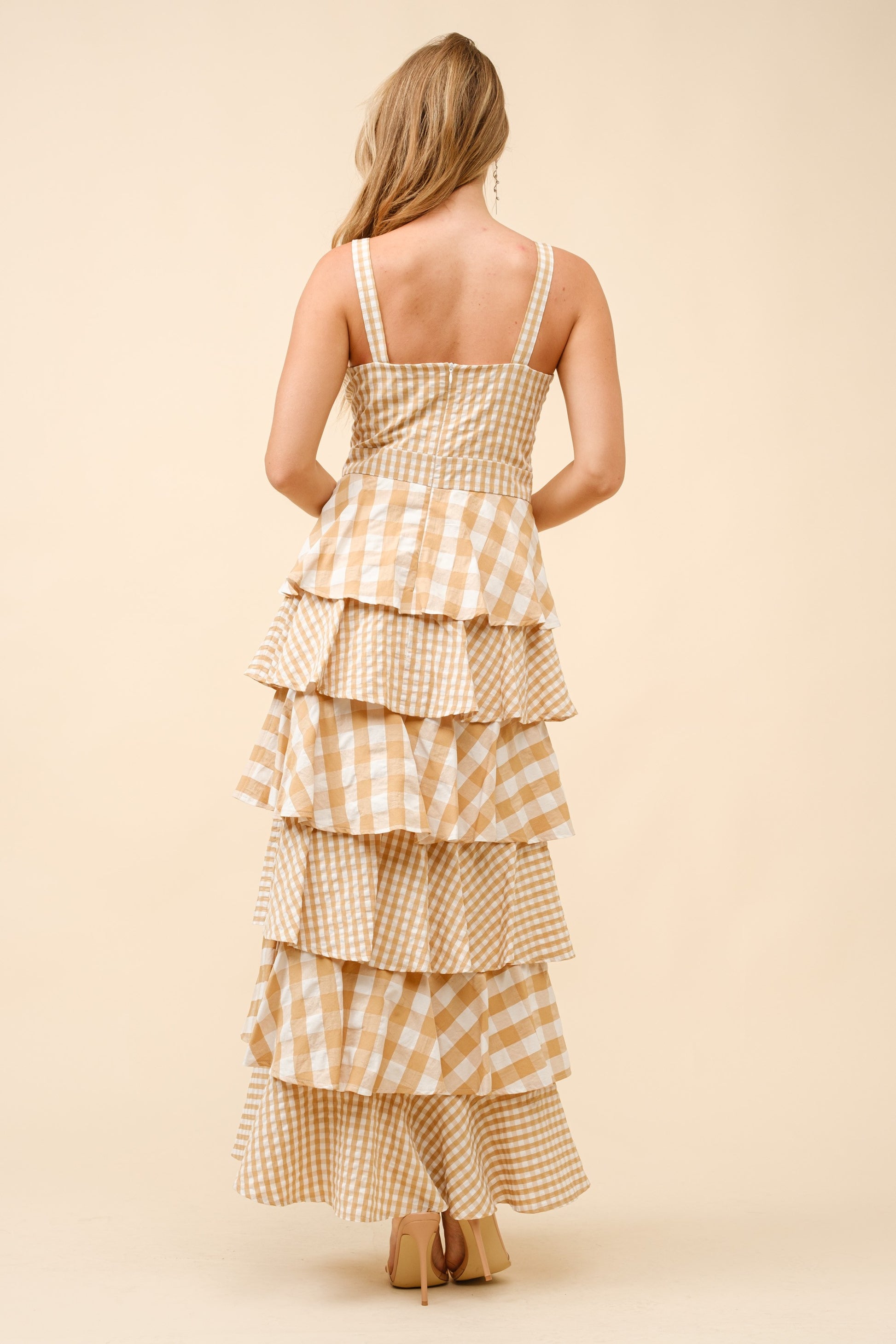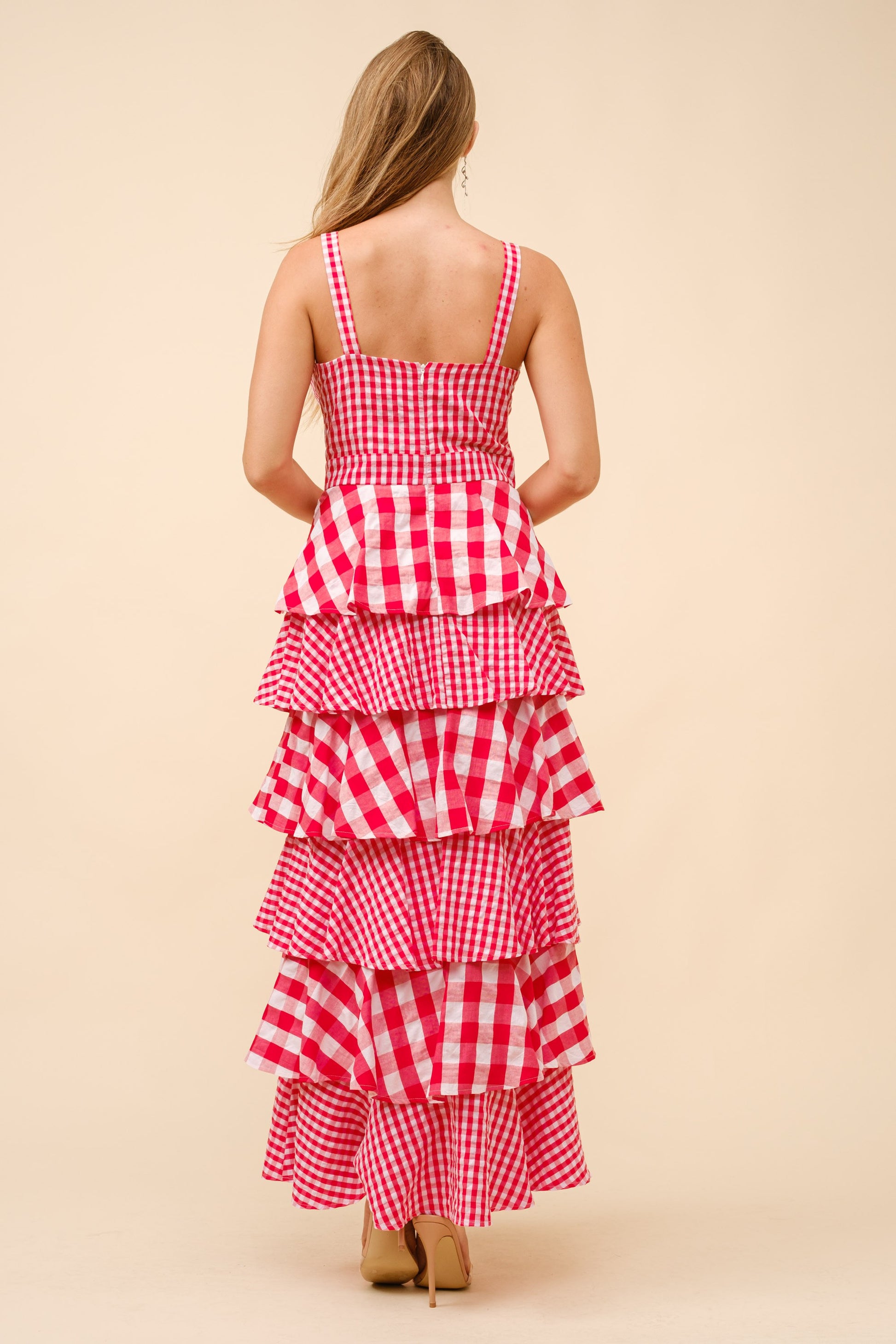 Gingham maxi ruffle sleeveless dress SELF:100%COTTON LINING:97%POLYESTER 3%SPANDEX Model is wearing size: S Model Measurements Height: 5' 7.5" Waist: 24" Bust: 32C" Hips: 36"