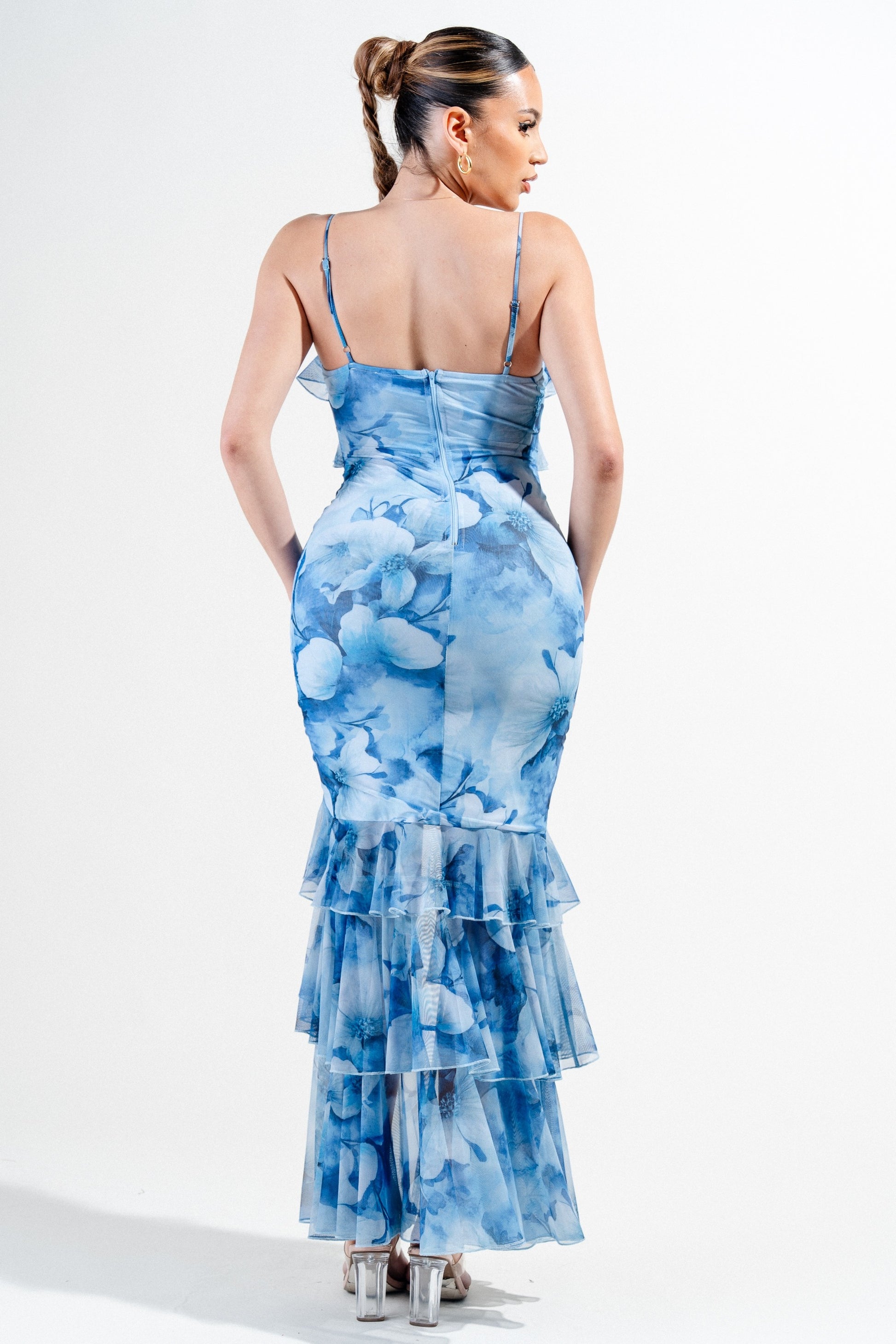MESH PRINT RUFFLE DETAIL V-LINE CAMI MAXI DRESS