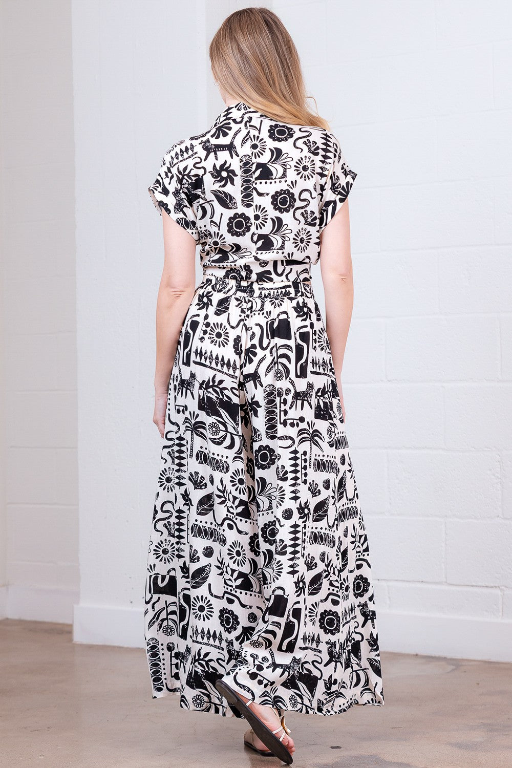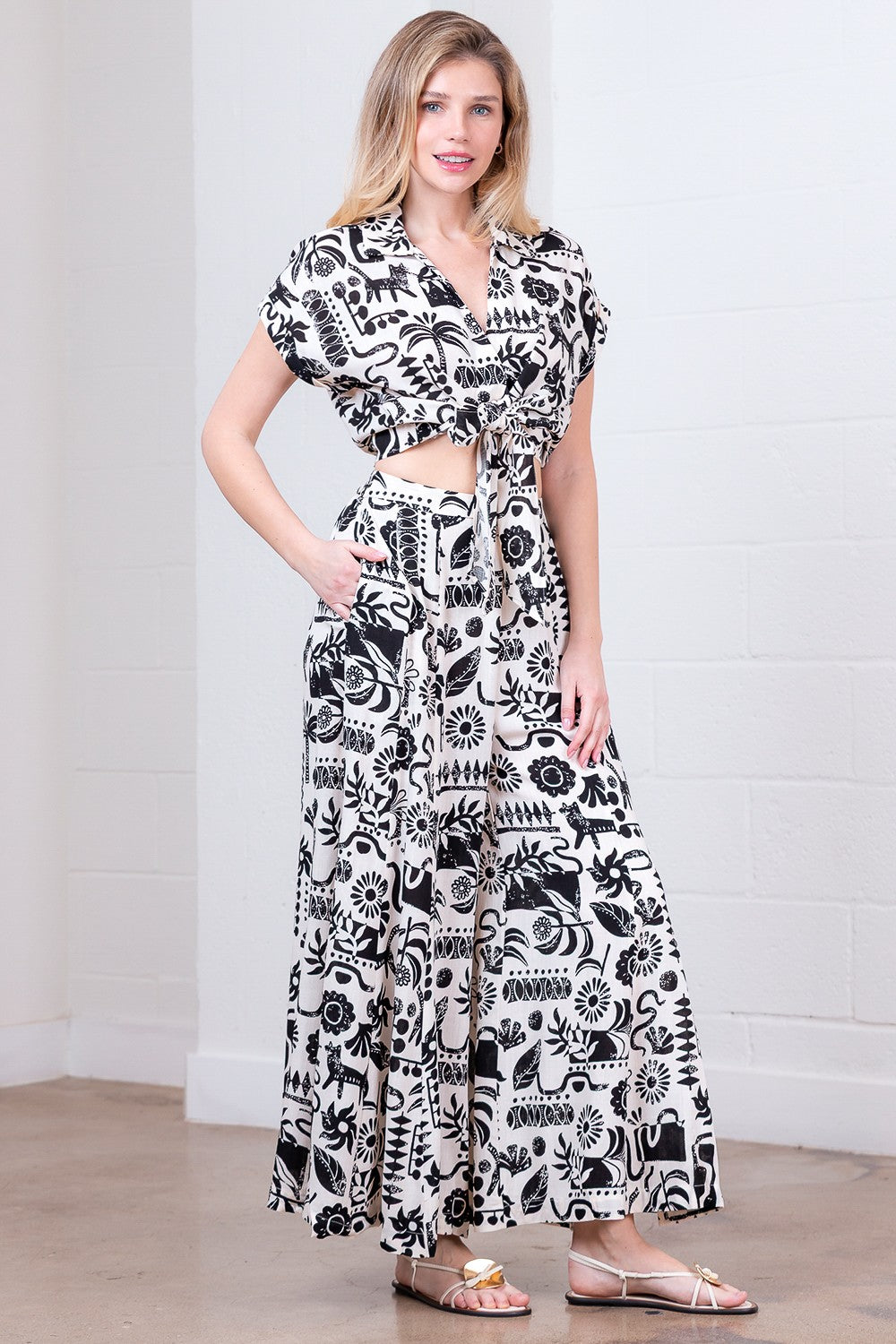 Style: Mix Print Top and Pants Set -Stretch: No Stretch -Color: Beige/Black -Pattern Type: Mix Print -Details: Front Tie, Lining, Wide Leg, Half Sleeve, Back Elastic Waist,