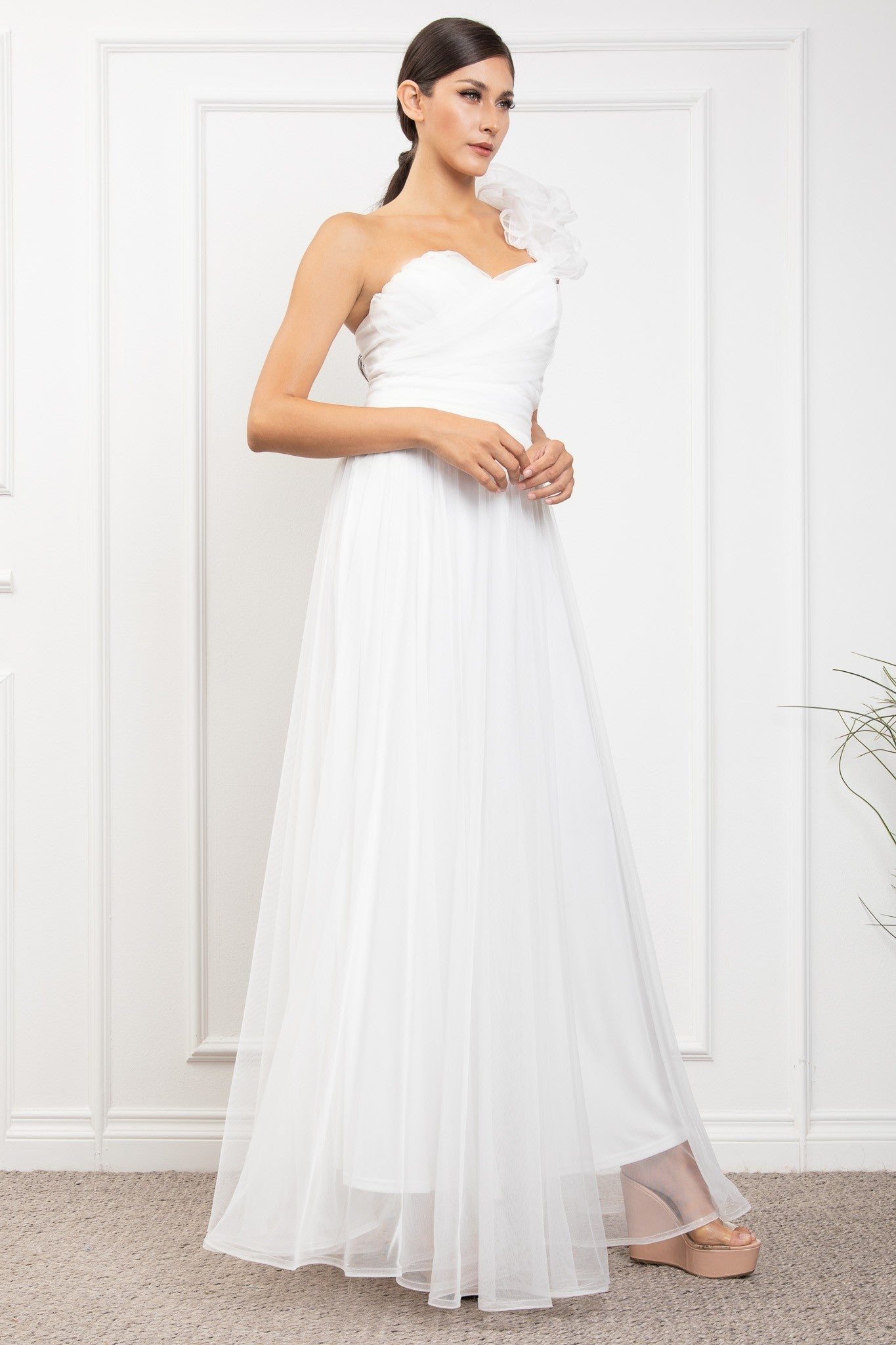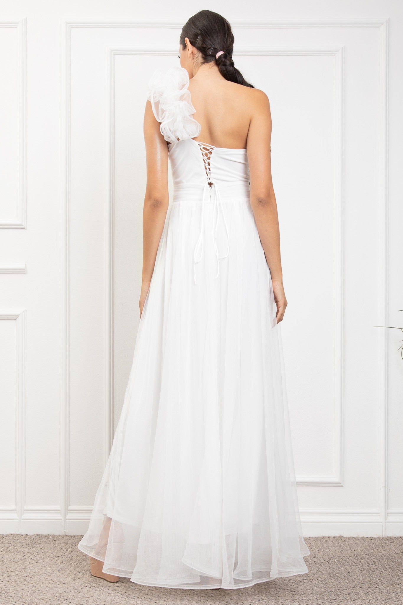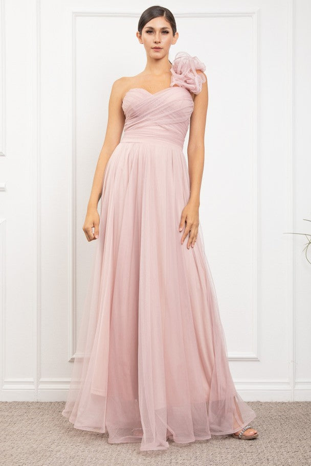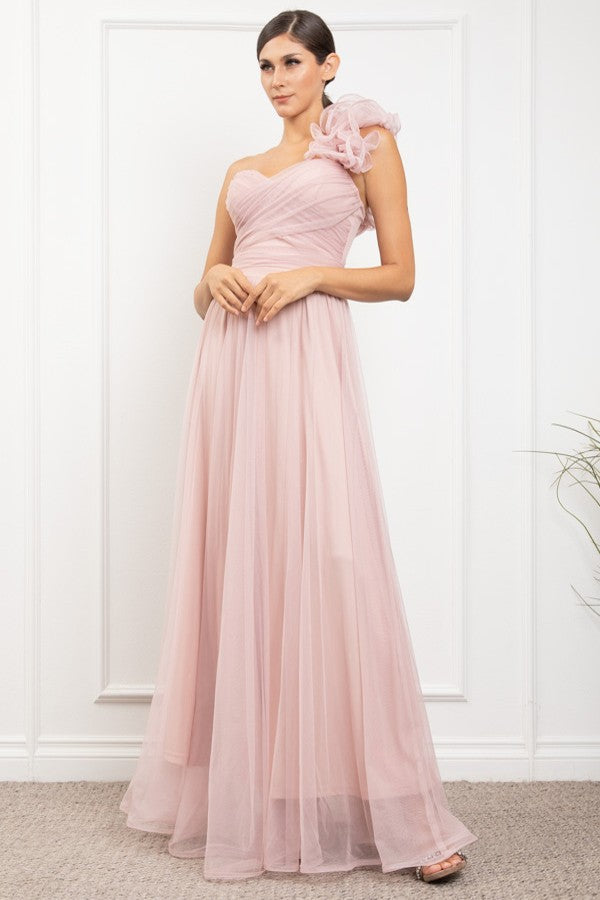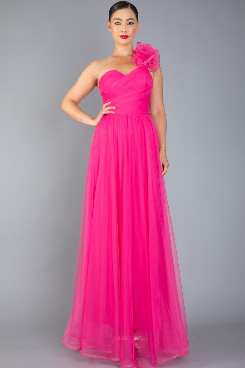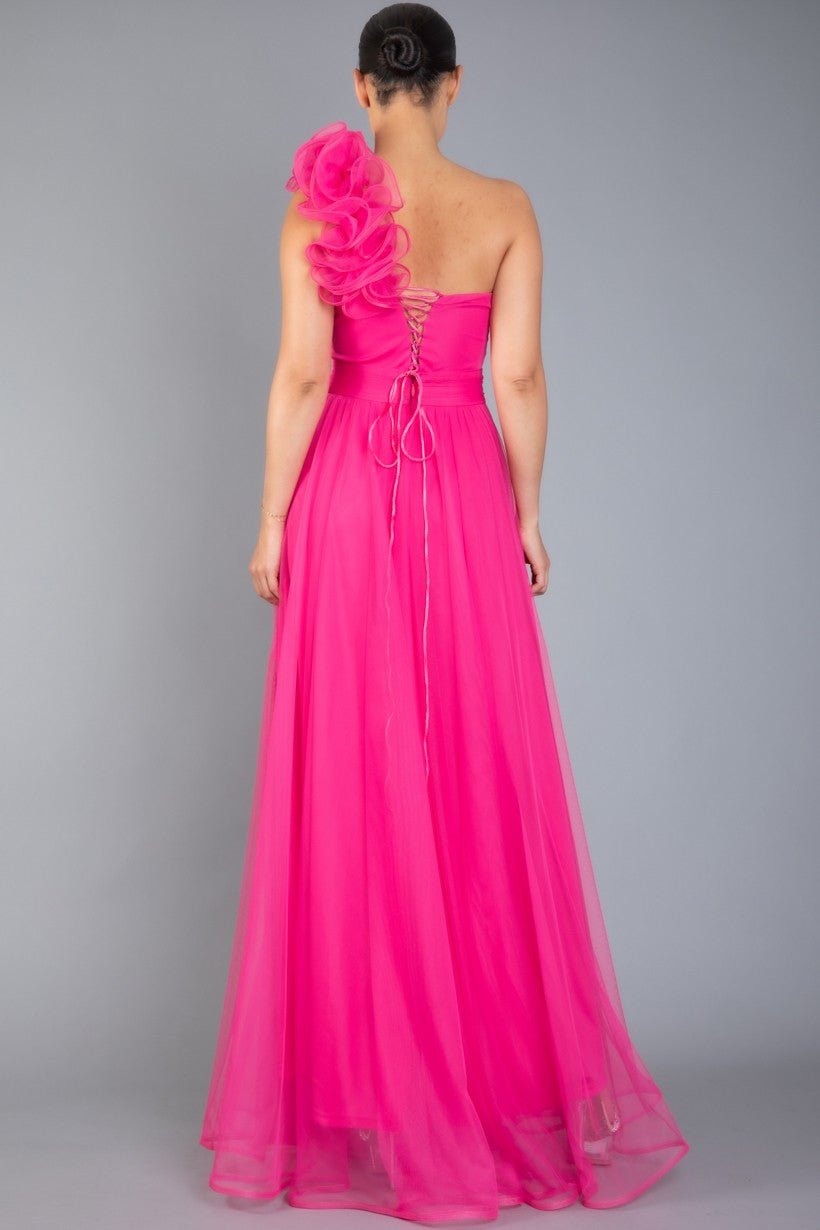 ONE SHOULDER MECH DRESS W/ BACK LACING W/FLOWER DETAIL