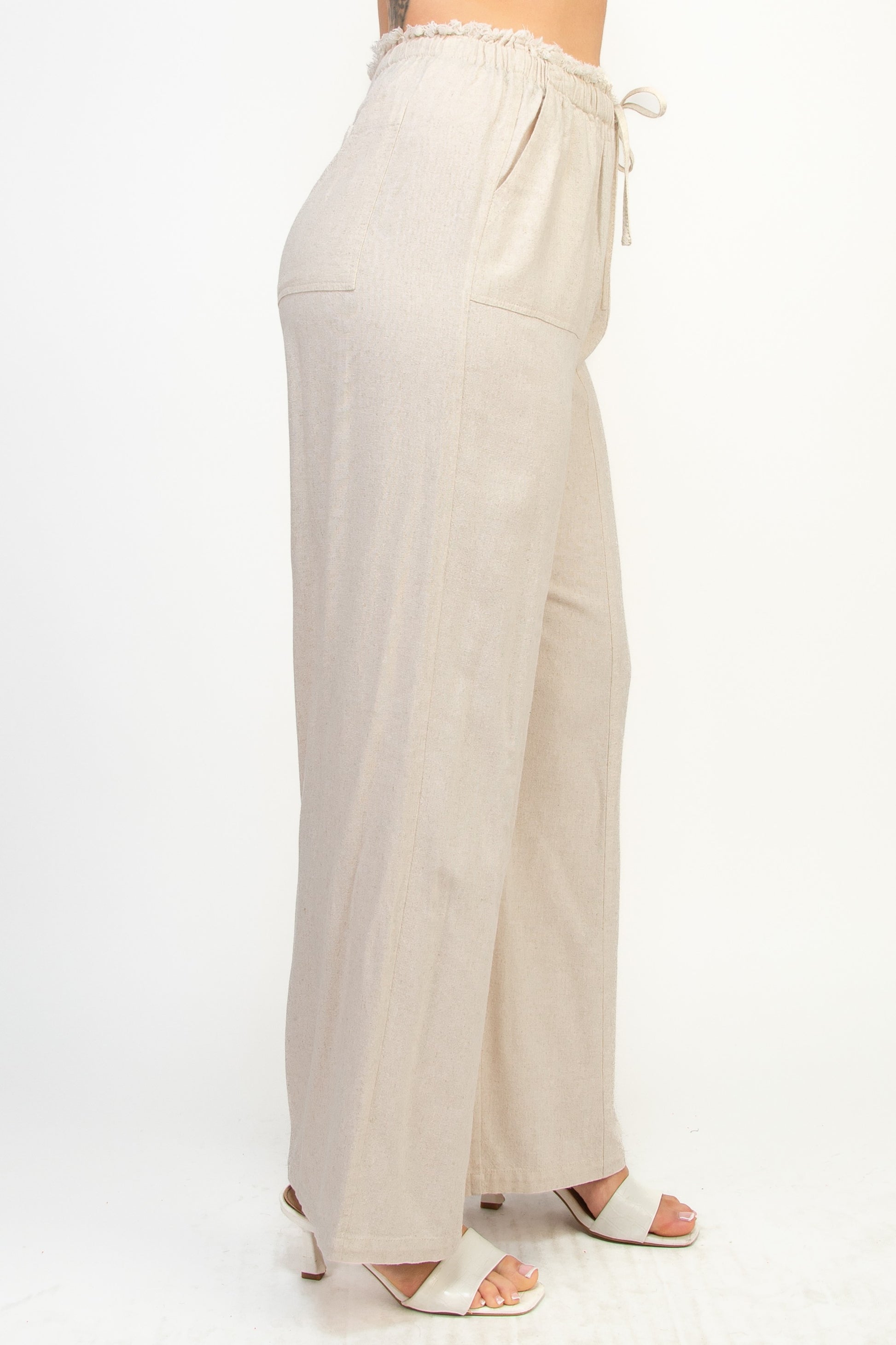A pair of quiet luxury pants in linen fabric featuring elastic high-waist