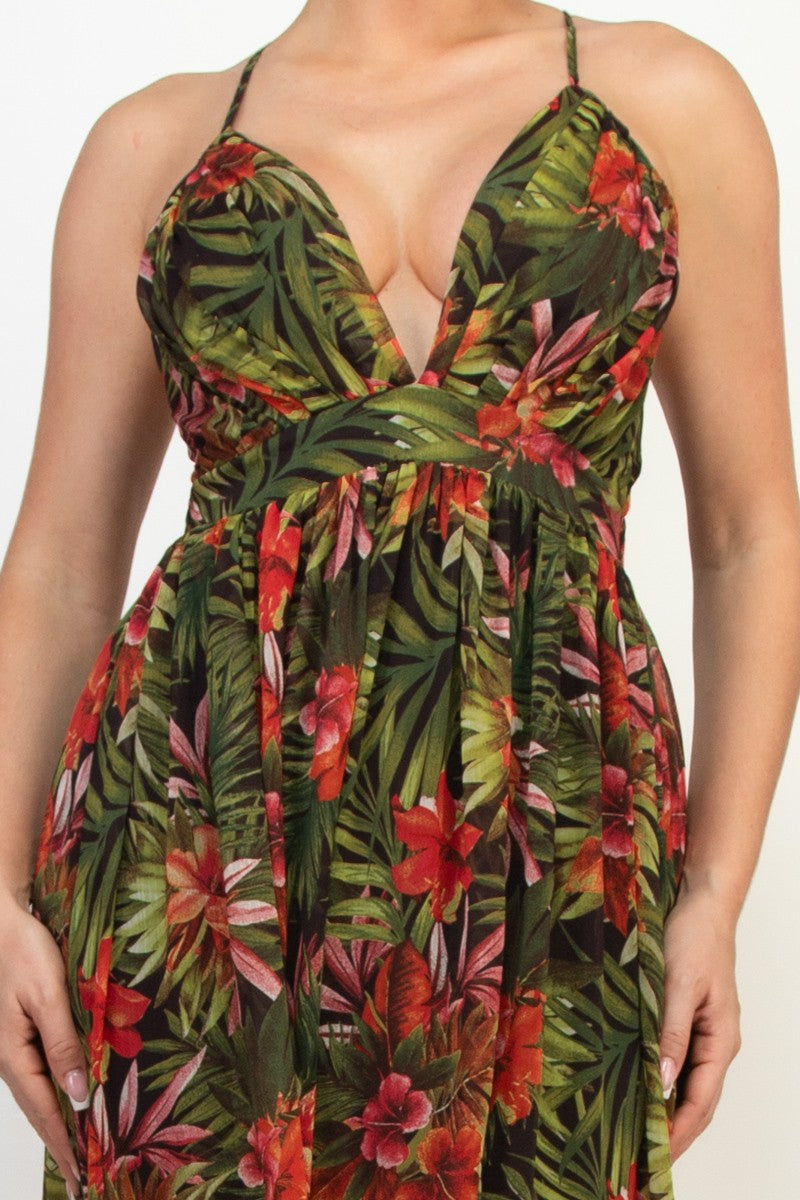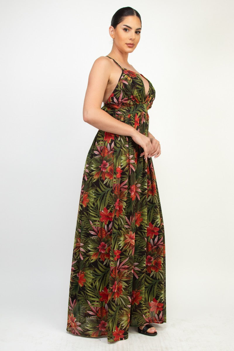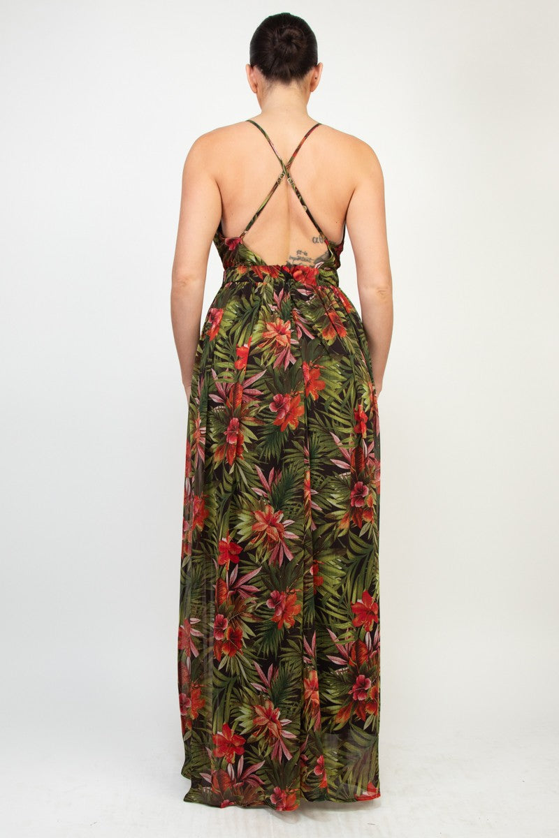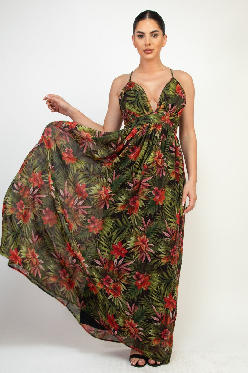 A boho trend maxi dress with tropical prints pattern featuring a plunging