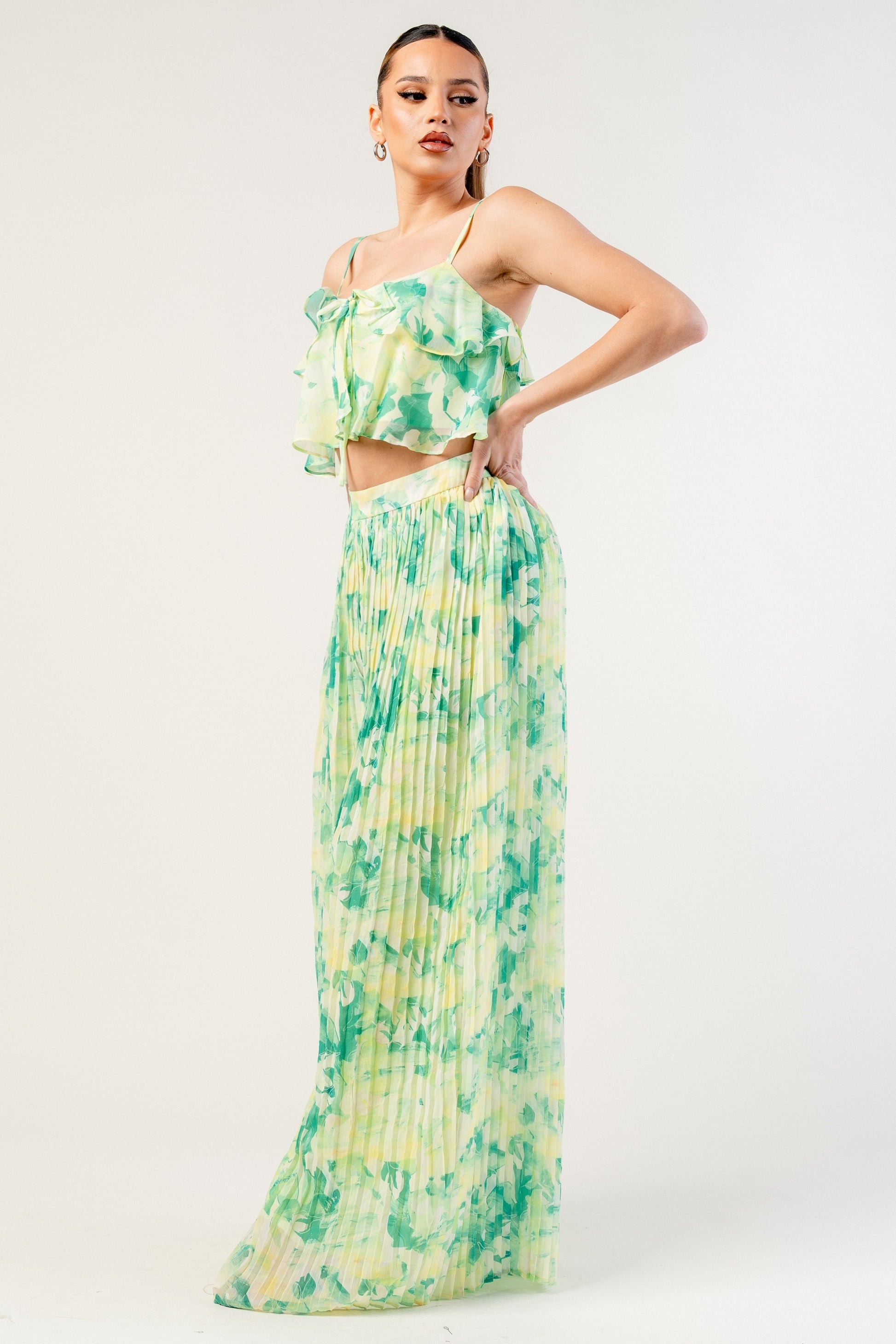 Yoryu Chiffon Print Top & Pleats Wide Pants Set